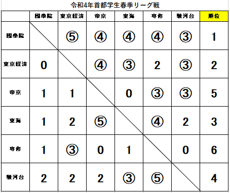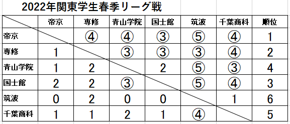 | | 2022年 4月17日 首都学生春季リーグ戦が国学院大学淵野辺グランドで開催されました。男子1部校/國學院大學・東京経済大学・帝京大学・東海大学・駿河台大学・専修大学/結果1勝4敗 6位