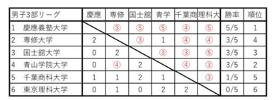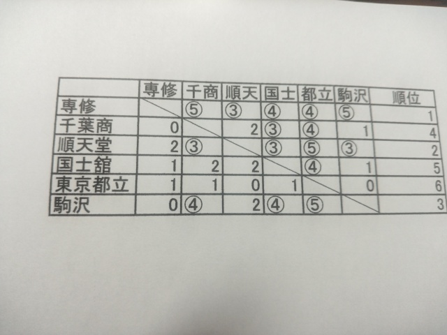 | ああぁ・・・ またしても「あと一歩」 初戦4-1対青学 2戦5-0対中央学院 3戦5-0対国士舘 圧倒的に戦い日をまたぎ4戦2部降格の城西大学2-3惜敗 5戦5-0対茨城大学 結果は4勝1敗 2位 ※枠線のサイズをマウスで変更するとレイアウトが崩れますのでサイズ変更はおすすめいたしません。